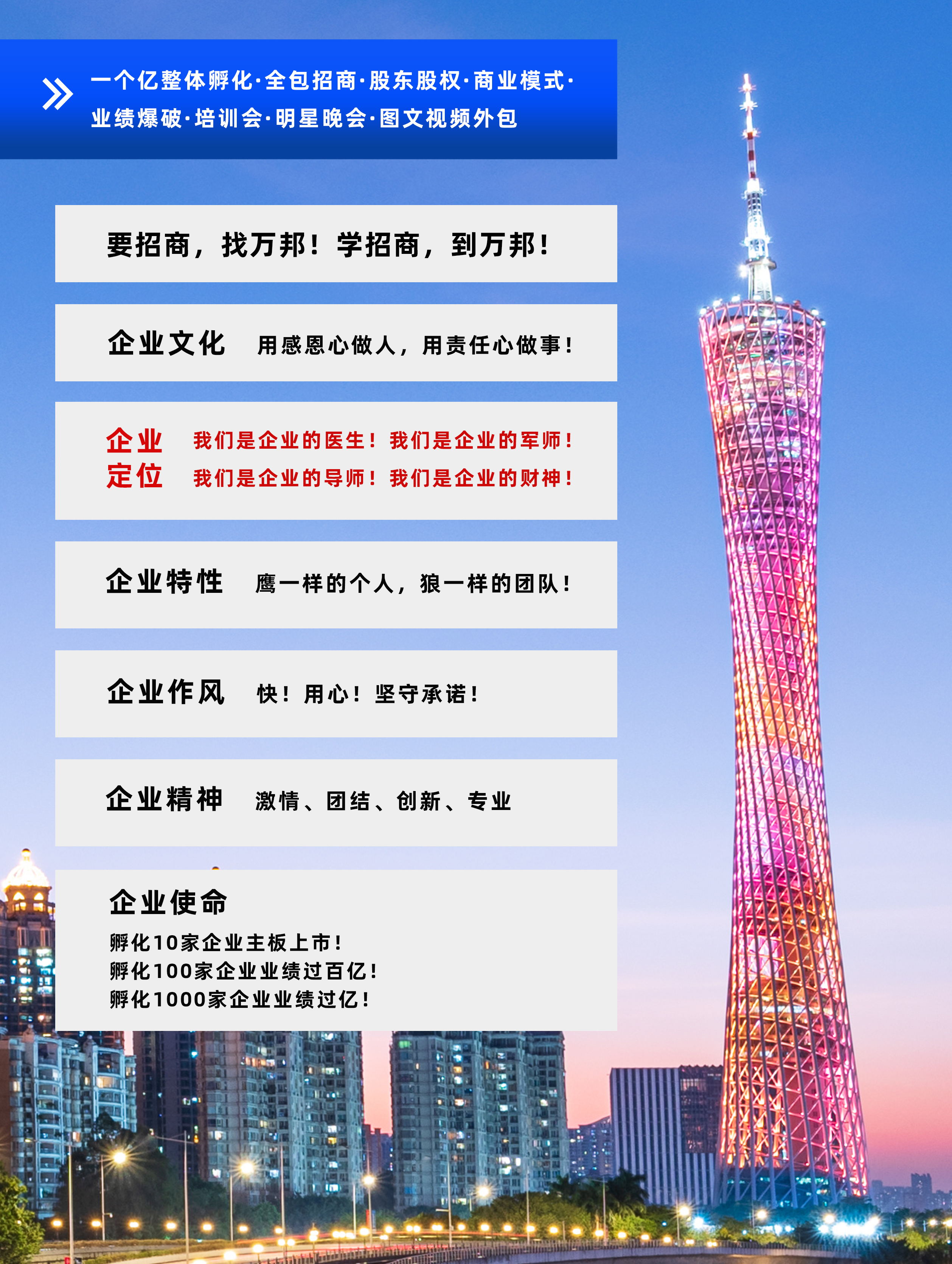 萬(wàn)邦集團(tuán)成立于2003年6月,專注于為企業(yè)進(jìn)行招商和整體孵化,包含公司診斷、產(chǎn)品定位到量身打造商業(yè)模式系統(tǒng),再到投人、投錢、投資源,一起干的分紅股東招募,鐵血軍團(tuán)的打造,全國(guó)招商會(huì)議,為企業(yè)建立一套完善;成熟的招商系統(tǒng),教育系統(tǒng)、培訓(xùn)系統(tǒng)。